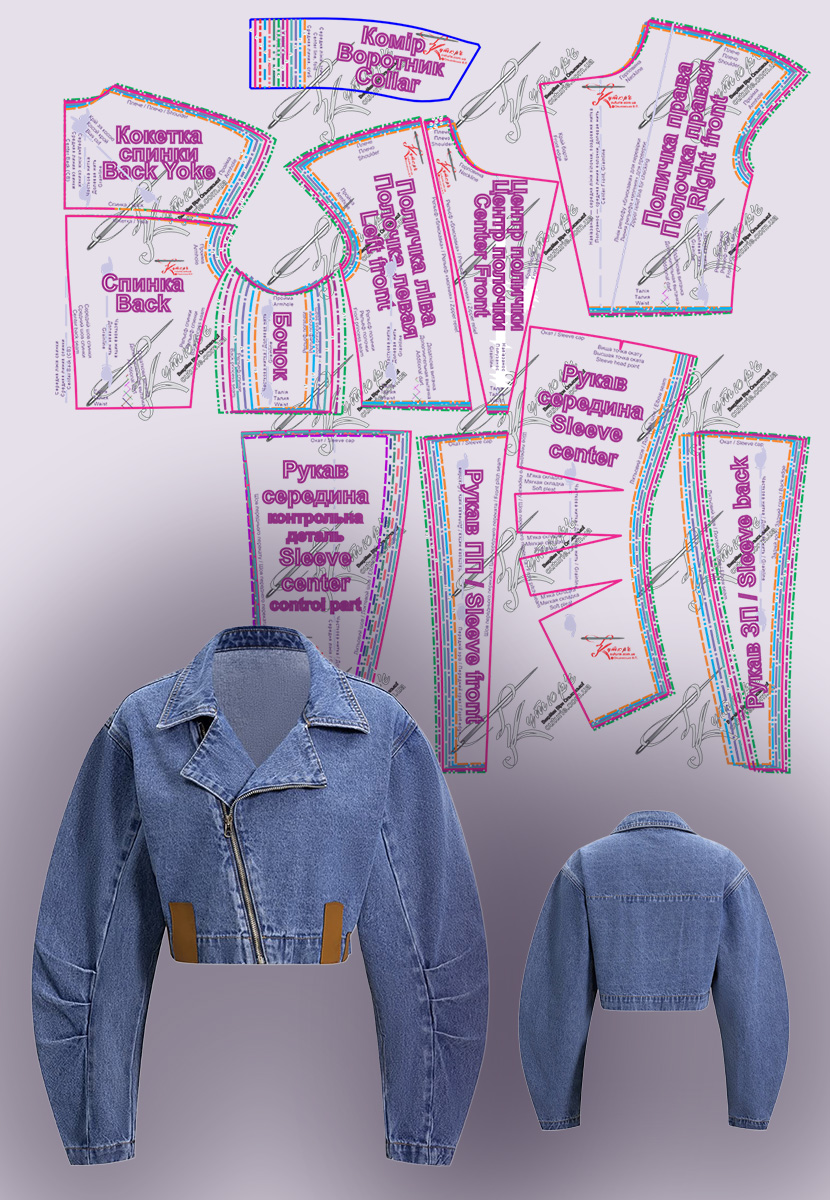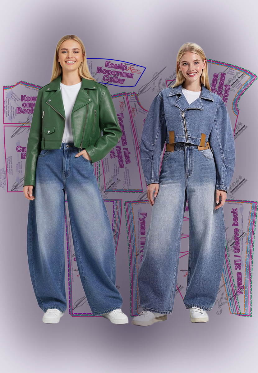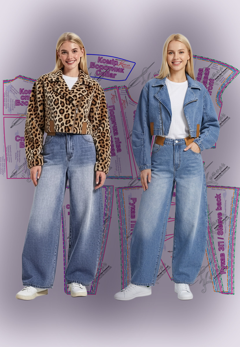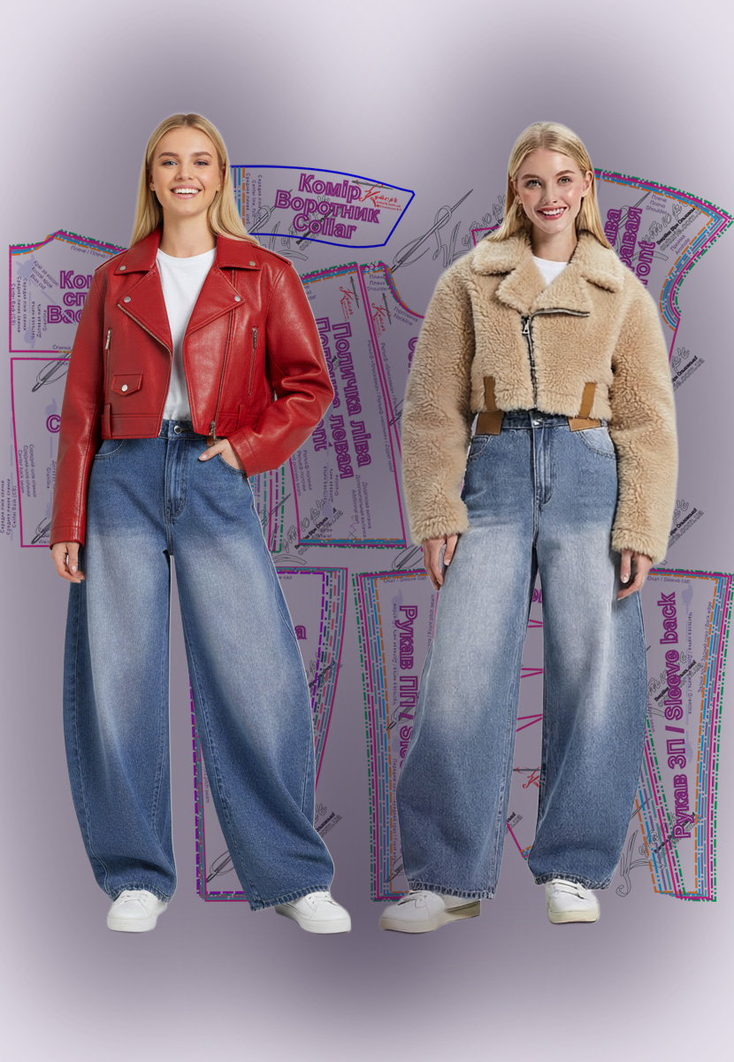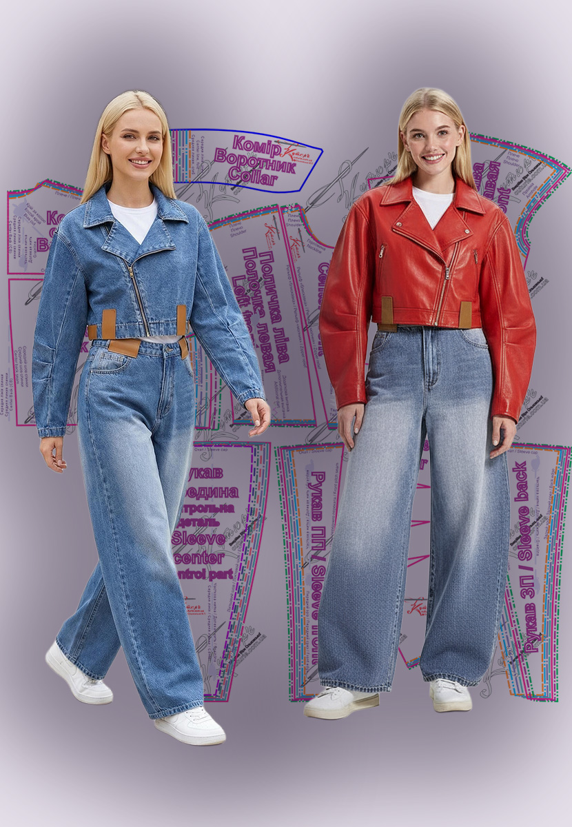 - Как сшить короткую женскую куртку косуху в стиле урбан, подходящую для носки с брюками свободного силуэта типа «багги» – самая простая последовательность шитья.