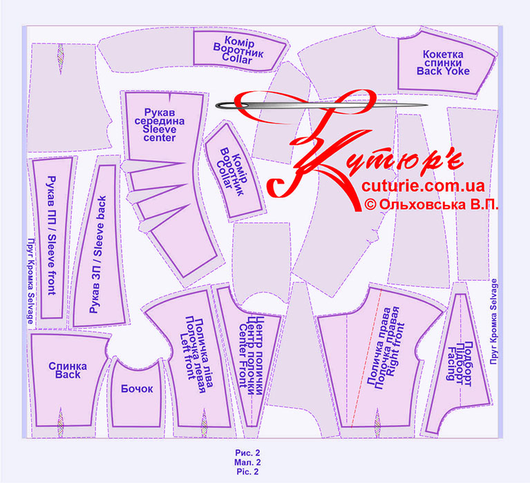 Обратите внимание, что детали подбортов выкраиваются по выкройке Центр полочки. Воротник верхний кроим в разворот, а нижний – из двух половинок по косой, то есть, чтобы ни один срез не совпал с долевой нитью (в идеале – линия раскепа по долевой).